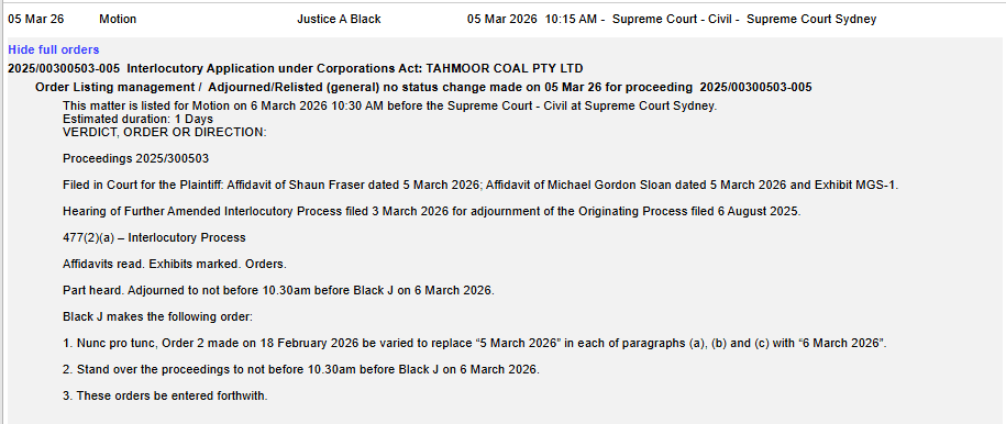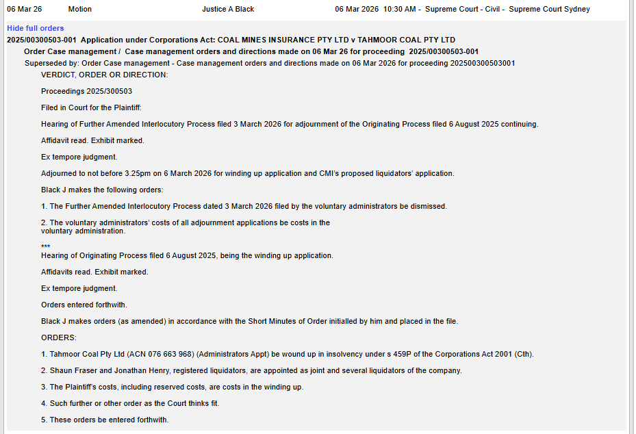 “As you may be aware, the Supreme Court of New South Wales (the Court) ordered a further adjournment of the application to wind up the Company to 5 March 2026. The Court delivered its verdict on 6 March 2026 and liquidators were appointed.